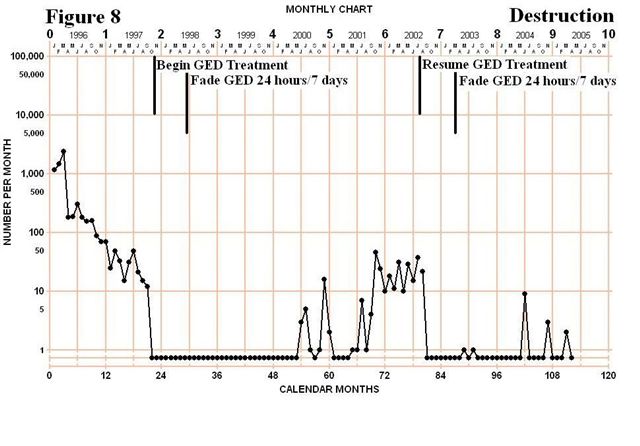 Figures 6 to 10 depict the total monthly frequency of GR’s AGG, HDB, DES, MDIS and NCMP. For GR, GED treatment began in September 1997 for AGG and HDB and in October1997 for DES, MDIS and NCMP. What is clear across charts is that the introduction of the GED led to a rapid deceleration to zero when it was made contingent on that behavior category. Two other interesting results also occurred with GR. First, when treatment began for AGG and HDB his DES behavior also decelerated to zero even though the contingency did not change for that behavior category. Secondly, GR’s NCMP behavior was unaffected by the introduction of the GED to other categories but immediately went to zero when GED was made contingent on NCMP behaviors. Figures 6, 7 and 8 show that the GED was faded from his program in less than a year and the positive programming maintained his behavior for a few years. However, once in August 2001 and again in August 2002 a short reinstatement of the contingency was necessary due to some intense aggressive behaviors and frequent destruction. In both cases within a few months the GED was removed from his program and has remained off for the past 28 months.